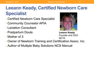 The Newborn Care Training Academy course instructs and educates individuals on the care of a newborn birth-3 months. Gentle Ventures entire curriculum is approved by the Newborn Care Specialist Association for certification and the Holistic course is also accredited by the International Maternity and. Baby Nurse Training course and Infant CPR Certified PLEASE.
